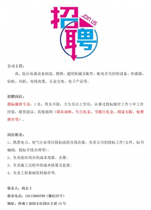 招聘:财务、质检、采购、销售、销售内勤、投标预算。...